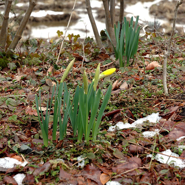 写真は、庭咲で咲こうとしている野良スイセンです。