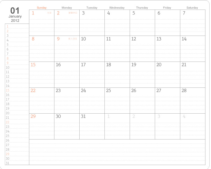 モレスキンmoleskin ラージサイズ手帳用のカレンダー印刷データです。